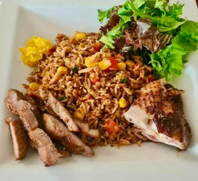 Rijst met groenten en keuze uit kruidige gestoofde kip of gegrild – een eenvoudige klassieker met diepe smaak.
