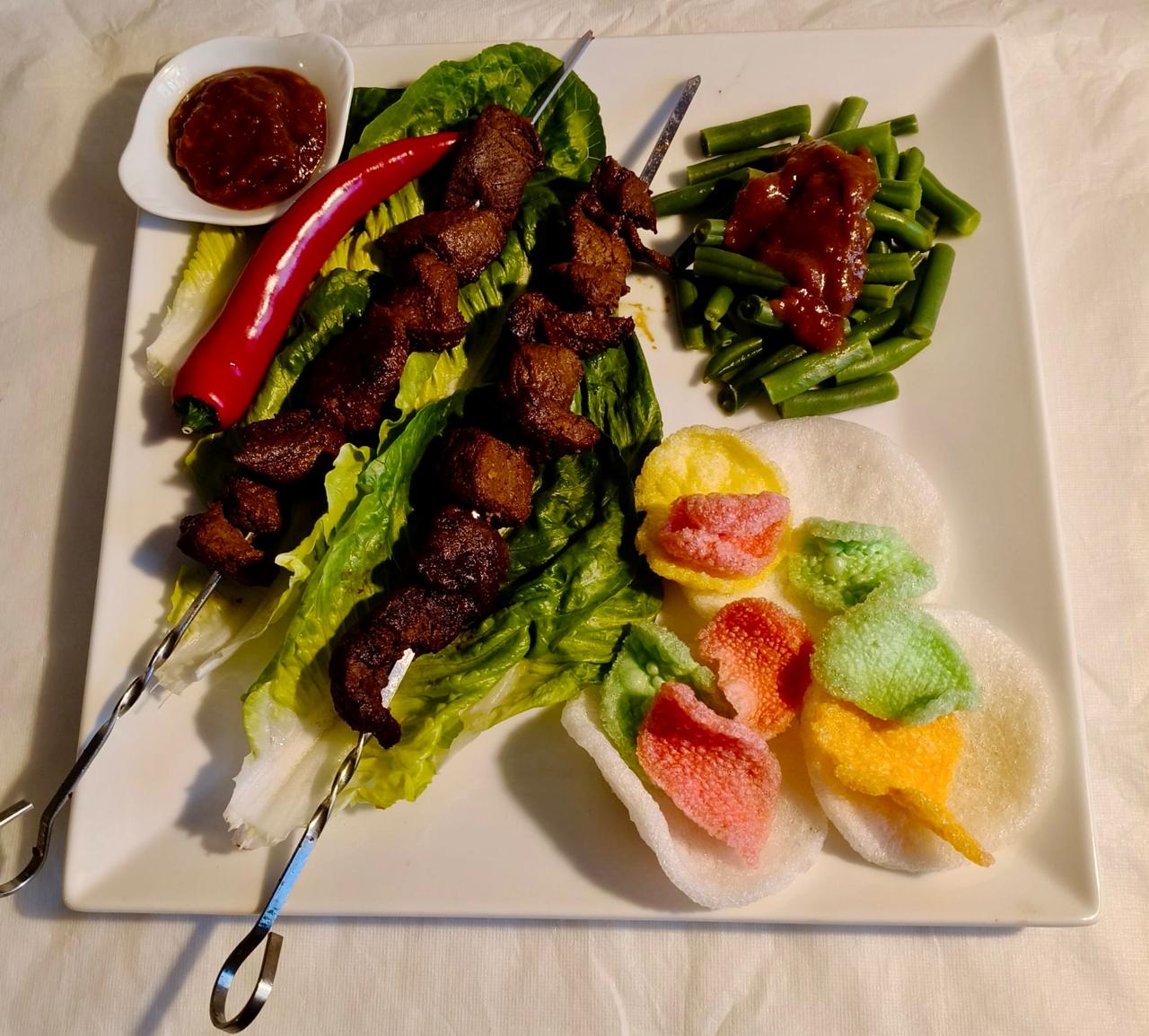 Rundvlees met spercibonen, kroepoek, soerangdan en een salade